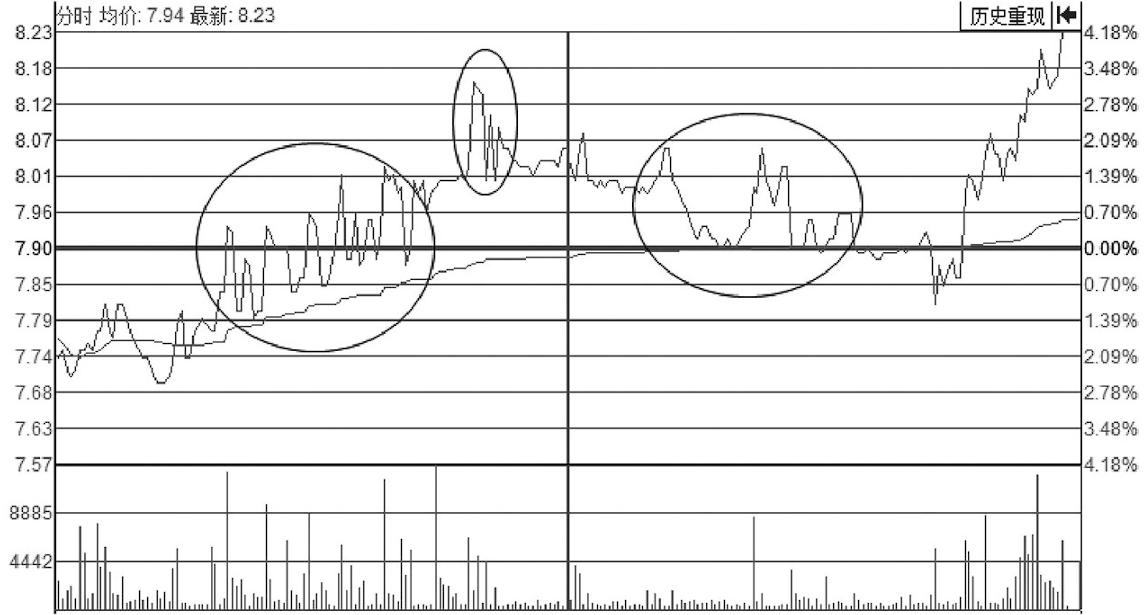 “刀刃波”是主力出货的一种常见手法。先用小资金把股价推高,散户以为又要创新高了,于是填单跟进。一见散户跟风,主力顺势出货,扔出手中的筹码,将买入盘全部打掉。等接盘稀少了,再次拉高股价,吸引新的跟风盘,然后又一次“恶狼扑食”,打掉所有的买盘。就这样反复几次,分时图上就形成了高高低低的“刀刃波”,如图2-1所示。