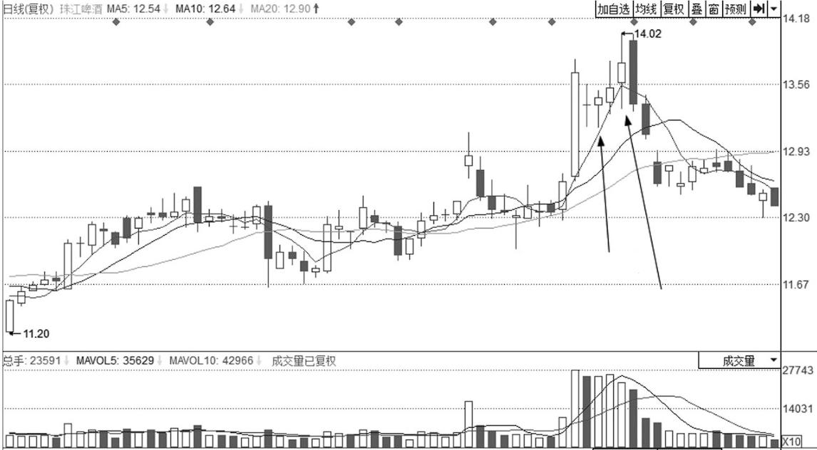 从图2-2的分时成交看,股价在此期间上蹿下跳,主力也完成了胜利大逃亡。该股的日K线图如图2-3所示。