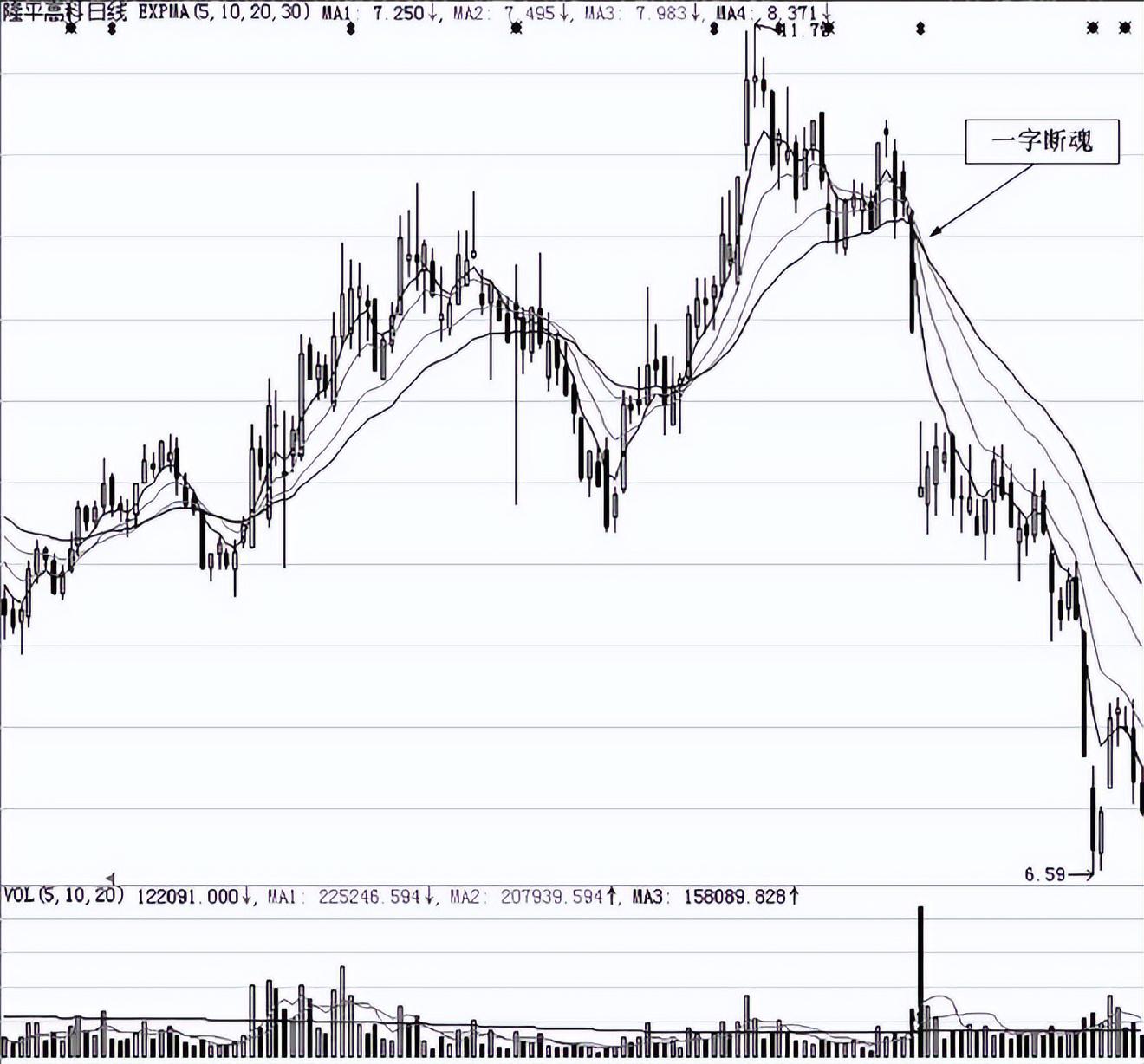 图2-1是隆平高科(000998)日K线走势图。股价经过前期的上涨后走出高点,随后股价进入高位盘整,无力上攻。突然出现一根大阴线,同时击穿多条均线系统,形成“一字断魂”形态,开启股价下跌步伐,此后股价急速下跌,跌幅巨大。