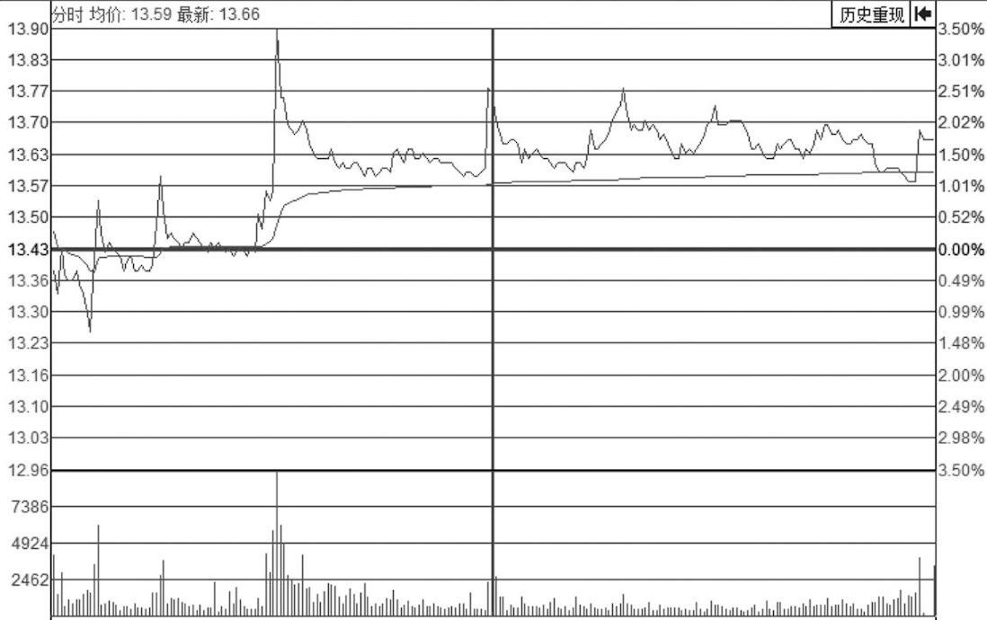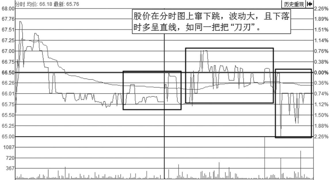 该形态被称为“刀刃波”,是指股价在分时图里上蹿下跳,且下落时多呈直线,如同一把把的“刀刃”,如图1-1所示。