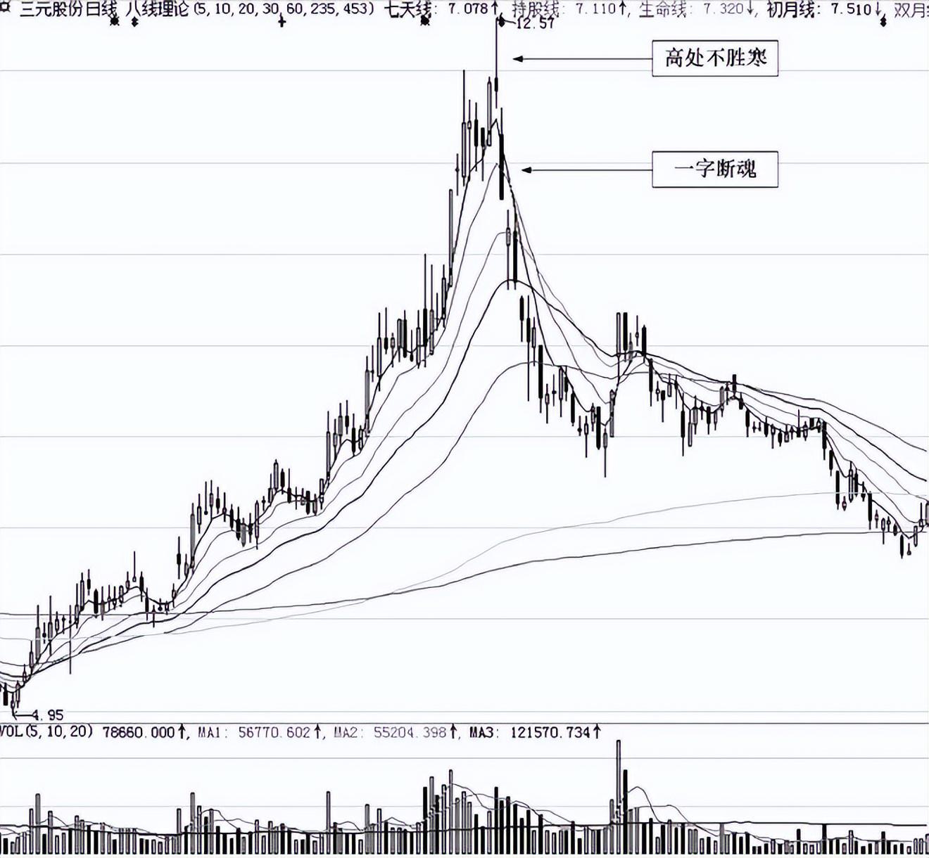 但我们也要注意到,在形成高点时,股票当日形态却是明显的“高处不胜寒”形态,指示卖出意义明显。当投资者没有及时卖出时,第二天股价接连走出“一字断魂”形态,此时投资者已经面临巨大的财富缩水现象。如果投资者仍没有在这一形态后选择卖出,而是选择长期持有,则到最后可获取的收益将所剩无几。这是投资者们必须注意的。