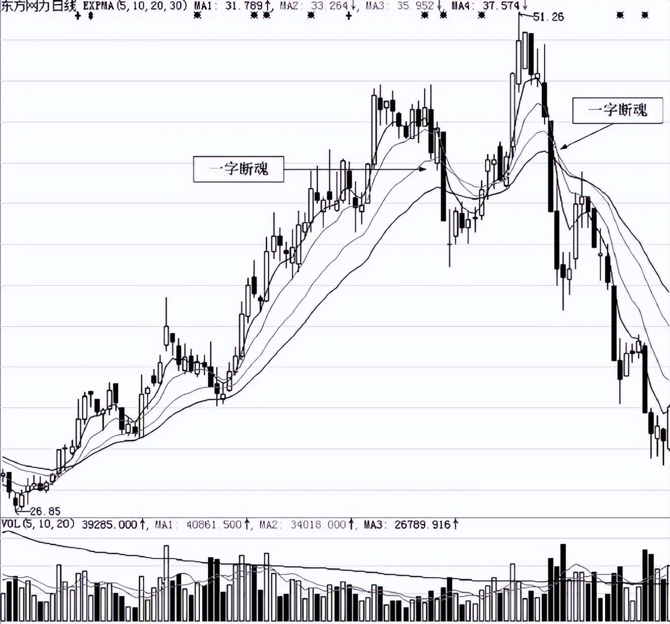 图2-3是东方网力(300367)日K线走势图。股价从前期的26元左右一路上涨到高点的51元以上,股价在这段走势中也走出了翻番的行情。主力资金兑现收益、出货离场的需求强烈,当主力完成出货后,股价立刻大幅下跌,而下跌最明显的标志都是以“一字断魂”开始的。