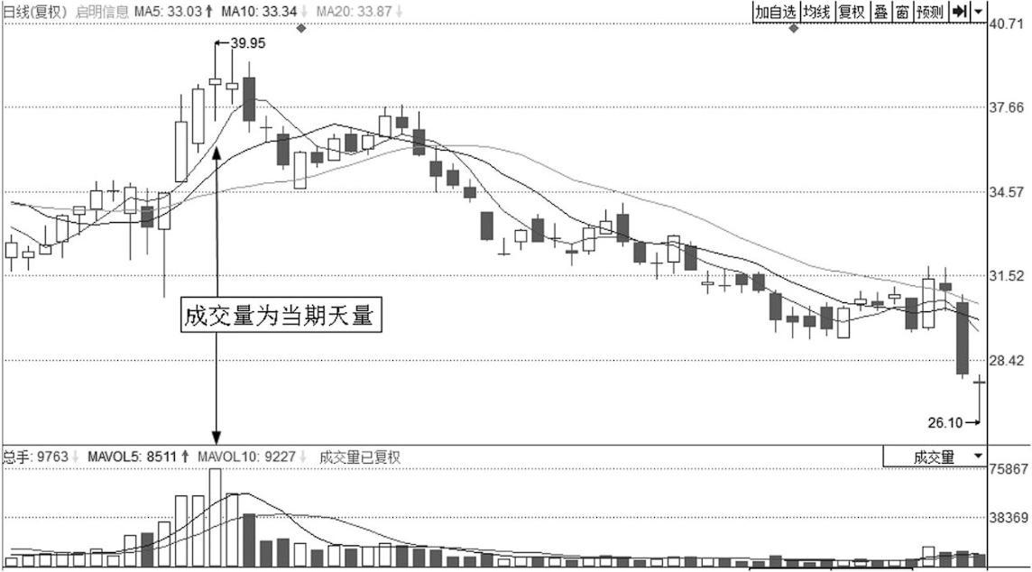 从当时的日线图上可以看出,箭头处当日的成交量亦为近期天量。短线主力将剩余的筹码甩出,顺利脱身。该股随后都在一路阴跌,难有行情,如图1-3所示。