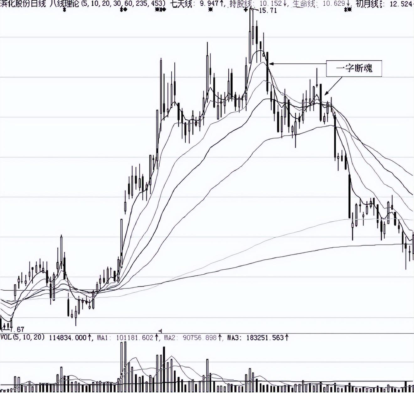 图2-4是滨化股份(601678)日K线走势图。股价在行情翻倍后出现了高位滞涨,随着出现的“一字断魂”走势,股价开始向下运行,接连以后出现的“一字断魂”,股价快速下跌,行情彻底终结。