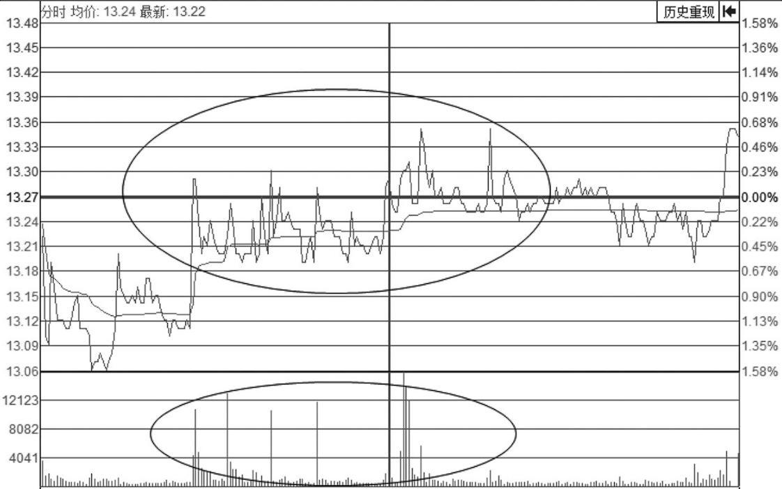 图2-1为珠江啤酒(002461)分时走势图。坐庄资金开始了潜逃计划,该天出现了多次高高低低的“刀刃波”,主力将挂单的买盘一口吃掉,股价直线向下,形成一把陡峭的“刀刃”。随后主力再用少量的资金将股价拉上去,再将跟风的买盘砸掉,如此反复,该区间形成了巨大的成交量,“刀刃波”成型,主力的目的也已经达到。