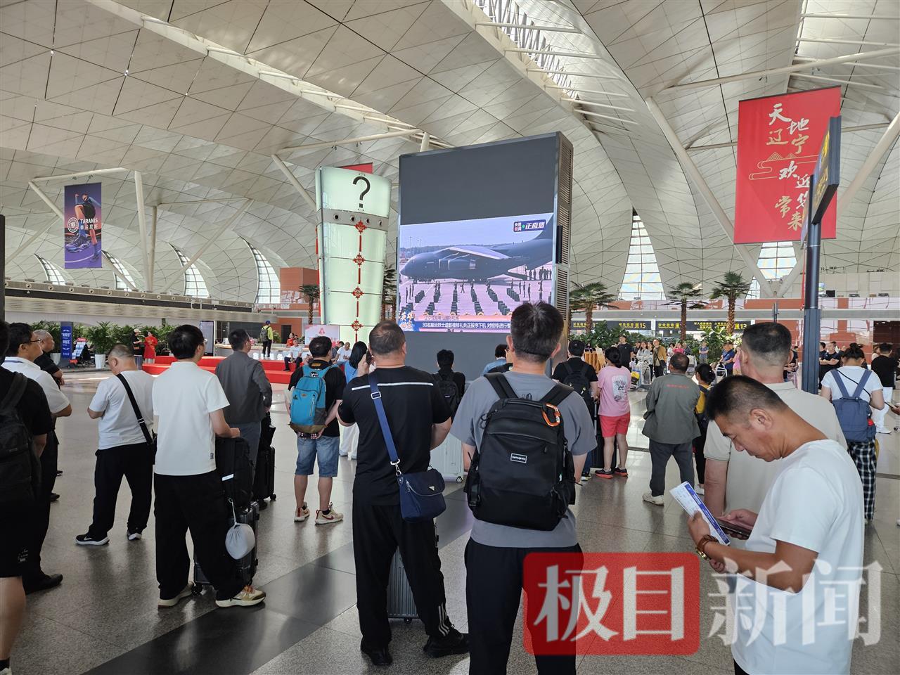 记者在现场看到瑞和网 ,待大屏幕设备调试好后,机场工作人员接入了央视新闻的直播信号,因设备位置距离机场T3航站楼二楼的入口较近,不少旅客进入进站口后驻足观看。