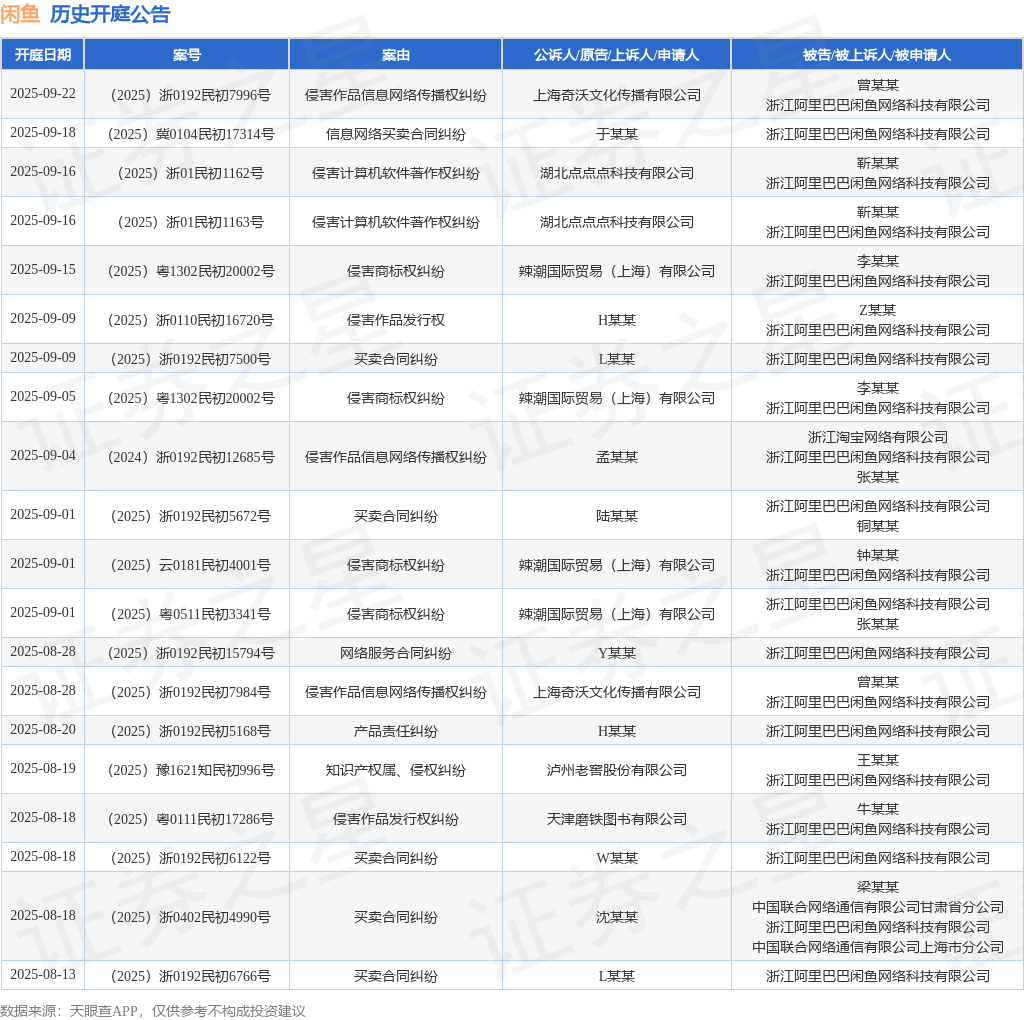 案号:(2025)浙0192民初4146号审理法院:杭州互联网法院案由:产品责任纠纷当事人信息: 原告/上诉人:付某某 被告/被上诉人:浙江阿里巴巴闲鱼网络科技有限公司开庭日期:2025年7月22日根据统计,近一年内以浙江阿里巴巴闲鱼网络科技有限公司为当事人的历史开庭公告有767则,其中案由为“网络服务合同纠纷”的公告以166则居首,其次为“信息网络买卖合同纠纷”有160则,“侵害商标权纠纷”有108则。历史开庭公告(前20条)如下: