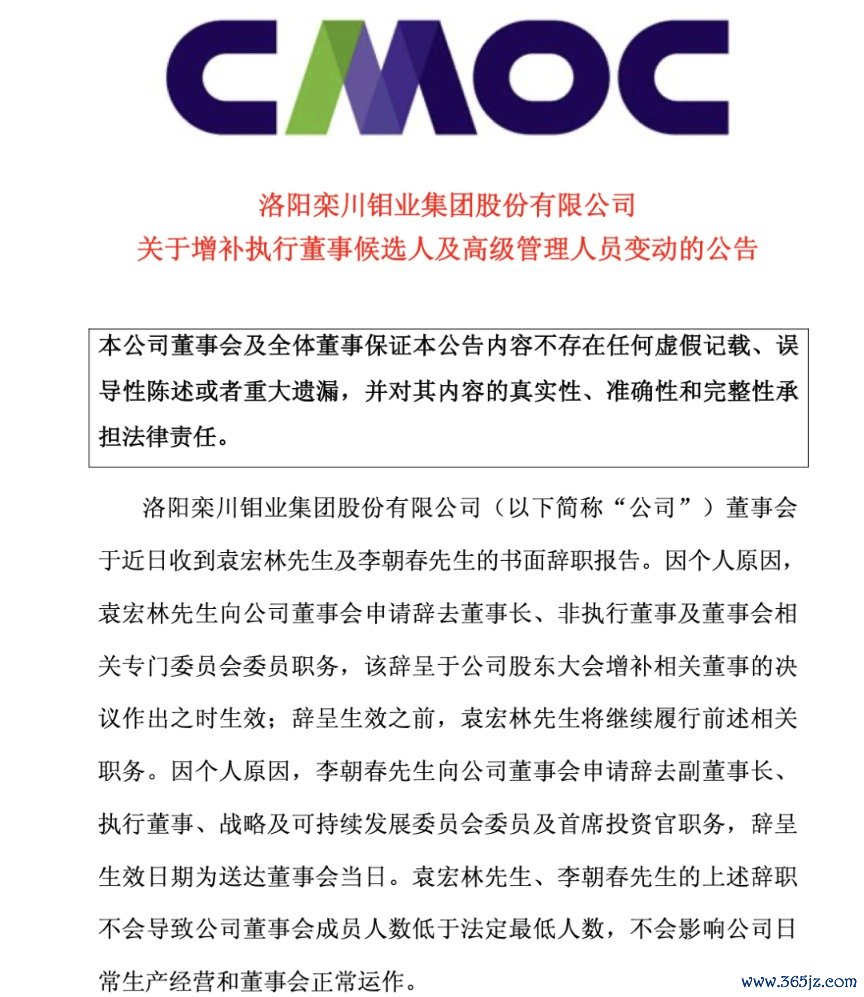一个月前,创下历史最佳业绩的洛阳钼业,迎来了一场高层人事重大调整:公司董事长袁宏林,公司副董事长、首席投资官李朝春辞任,增补阙朝阳、刘建锋进入董事会,同时任命四位新高管:阙朝阳任常务副总裁兼首席运营官、刘建锋任首席投资官、Kenny Ives任副总裁兼首席商务官、谭啸任副总裁。